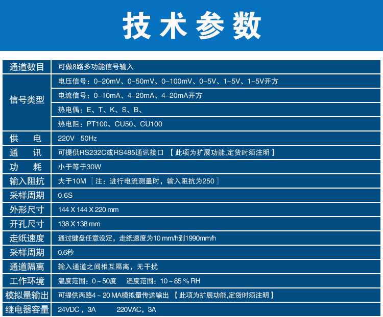 SIN-R1000有紙溫度記錄儀最多具有8路輸入通道,2路模擬量輸出,通道之間采用點點隔離;均可直接選擇接收多種熱電偶、熱電阻、壓力變送器、電壓、電流信號,并可對被測信號進行數字顯示及進行趨勢記錄和數字記錄,能在本身打印的120mm寬的紙格上同時記錄刻度值、時間及每一個信號的曲線,并將通道號印在各通道的軌跡旁。打印記錄功能采用進口固定式熱敏頭,無筆墨消耗,無筆位誤差,抗震動。